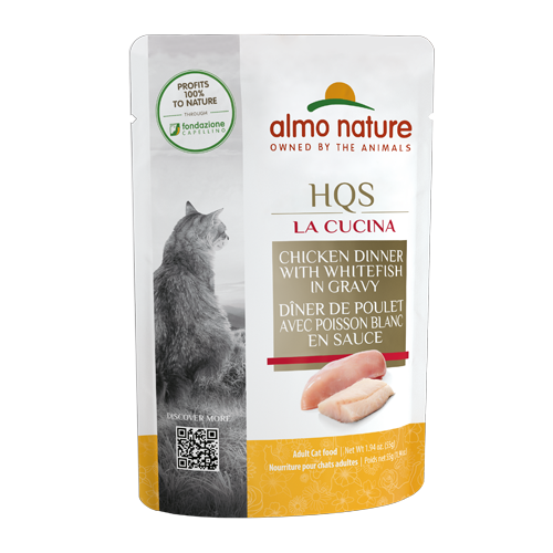 HQS - High Quality Sourced. Complete and balance cat food made with the finest fresh ingredients. With added vitamins and minerals. Complete and Balance - Feed your HQS La Cucina 4 pouches per day for every 8 lbs of bodyweight. Adjust as necessary for less active or more active cats.