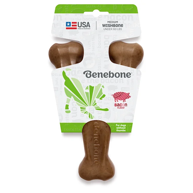 Super chewer? Bring it on. Benebones are tougher than real bones and last for weeks. We use only 100% REAL BACON for flavor. Trust us, dogs can tell the difference. The Wishbone is curved for a paw-friendly grip so your pup can quickly grab it and get a good chew going. Think about it: dogs don’t have thumbs. We make and source everything in the USA