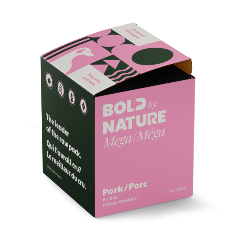 Complete protein. Complete flavour. Our Bold By Nature Mega Pork patties are full of farm-fresh ground pork meat, triple-ground bone, organ meats and veggies. Bring home the bacon and nutrition.
