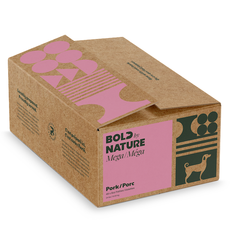 Complete protein. Complete flavour. Our Bold By Nature Mega Pork patties are full of farm-fresh ground pork meat, triple-ground bone, organ meats and veggies. Bring home the bacon and nutrition.