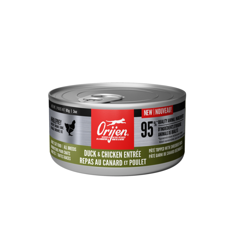 ORIJEN Wet Cat Food is a super premium pâté packed with WholePrey animal ingredients. ORIJEN Duck & Chicken Entrée includes raw WholePrey ingredients like poultry, organs and bone that provide the protein, nutrients and minerals your cat needs to be their best. At least the first 5 ingredients in every ORIJEN diet are fresh or raw animal ingredients, and the first 7 ingredients in this wet cat food diet are raw duck and chicken ingredients. Packed with 95% animal ingredients and no peas, lentils, legumes, carrageenan or gums, ORIJEN Wet Cat Food provides the nourishment your cat needs to thrive.