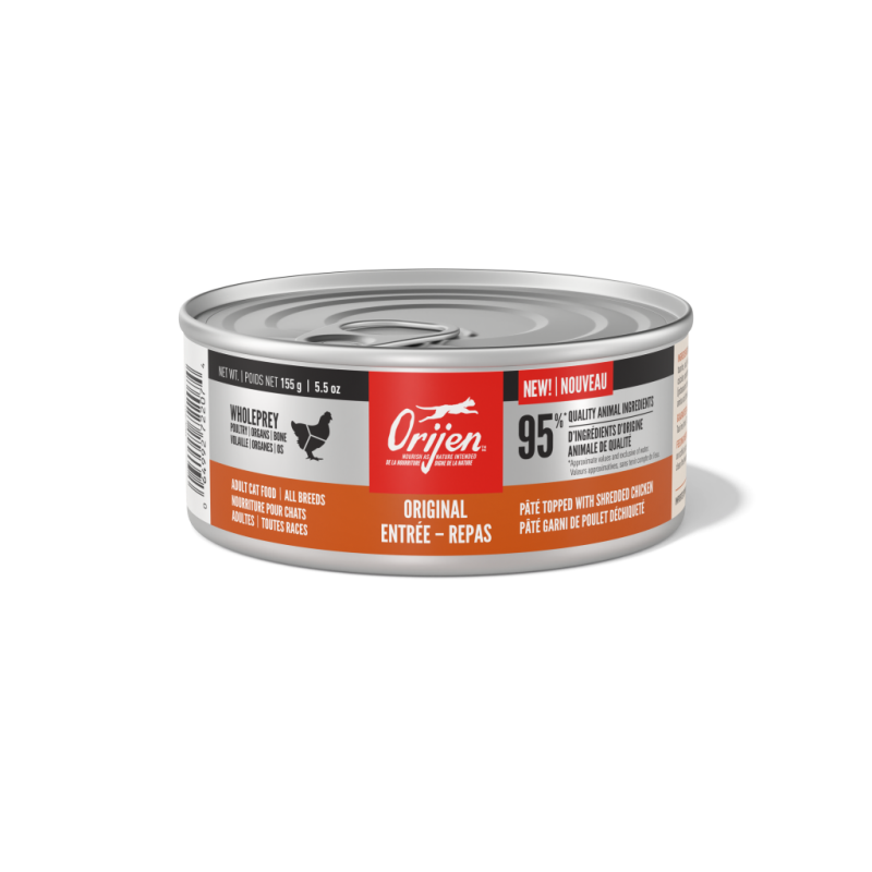 ORIJEN Wet Cat Food is a super premium pâté packed with WholePrey animal ingredients. ORIJEN Original Entrée includes raw WholePrey ingredients like poultry, organs and bone that provide the protein, nutrients and minerals your cat needs to be their best. At least the first 5 ingredients in every ORIJEN diet are fresh or raw animal ingredients, and the first 8 ingredients in this wet cat food diet are raw poultry and fish ingredients. Packed with 95% animal ingredients and no peas, lentils, legumes, carrageenan or gums, ORIJEN Wet Cat Food provides the nourishment your cat needs to thrive.
