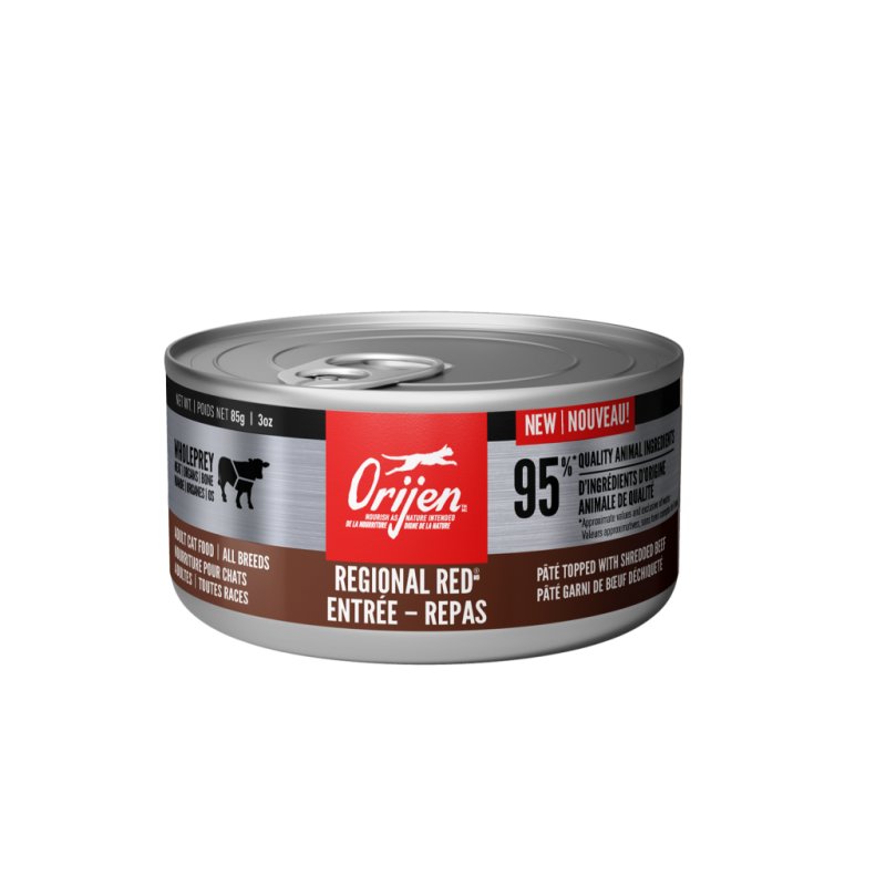 ORIJEN Wet Cat Food is a super premium pate; packed with WholePrey animal ingredients. ORIJEN Regional Red Entree includes raw WholePrey ingredients like meat, organs and bone that provide the protein, nutrients and minerals your cat needs to be their best. At least the first 5 ingredients in every ORIJEN diet are fresh or raw animal ingredients, and the first 10 ingredients in this wet cat food diet are fresh or raw lamb, beef, poultry and fish ingredients. Packed with 95% animal ingredients and no peas, lentils, legumes, carrageenan or gums, ORIJEN Wet Cat Food provides the nourishment your cat needs to thrive.