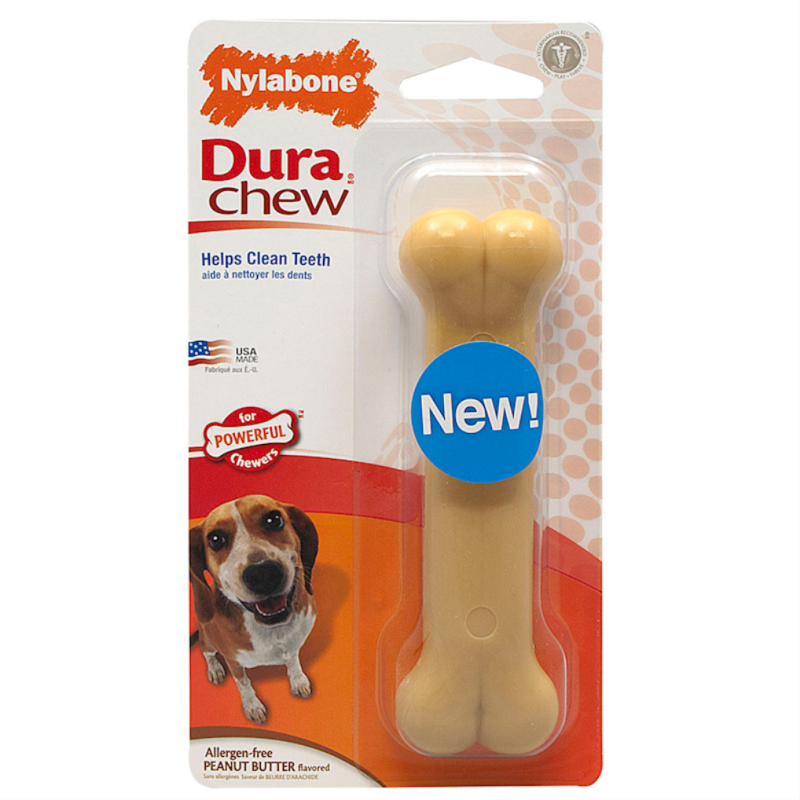 What dog can resist yummy peanut butter? Made with tough, durable nylon, the Power Chew DuraChew Peanut Butter Chew Toy was crafted with powerful chewers in mind. It provides long-lasting enjoyment, satisfies the natural urge to chew, and encourages positive chewing habits. Plus, the bristles raised during chewing promote clean teeth and help control plaque and tartar buildup. Go ahead and give your dog a Nylabone! Made in the USA! For dogs up to 35lbs.