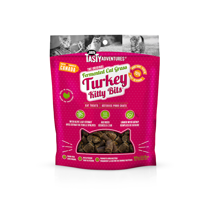 Our ORIGINAL FERMENTED CAT GRASS FLAVOURED KITTY BITS are gently dehydrated, air dried, and infused with our proprietary fermented cat grass blend. With OVER 75% fresh meat and spiked with catnip, your kitty is guaranteed a tasty adventure.