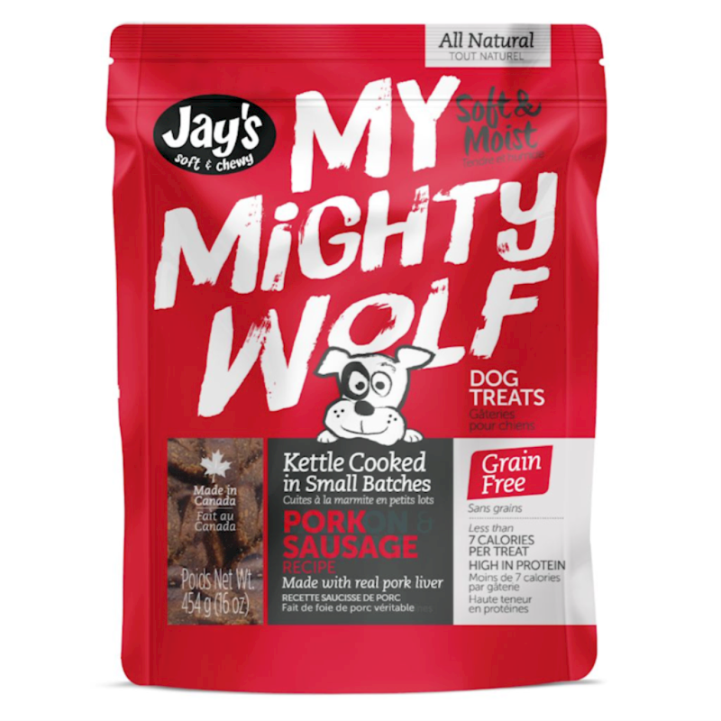 My Mighty Wolf Dog Treats are made with real pork and are completely grain-free! They're made with the freshest, human-grade protein and are an ideal training treat with only 6.5 calories per treat!