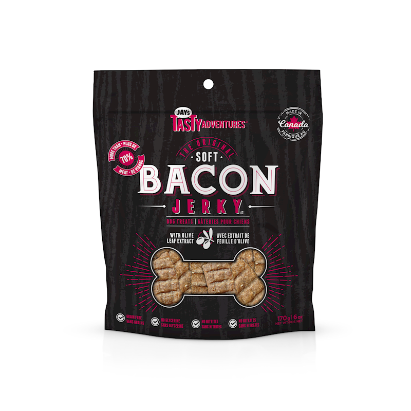 Our Original Soft Bacon Jerky is gently cooked, air dried and uncured and we never use Nitrites or Nitrates. With over 70% fresh meat included, your dog is guaranteed a tasty adventure!