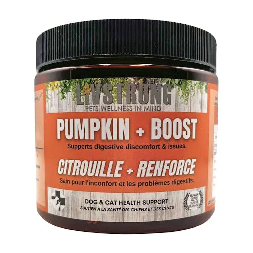 Livstrong Pet Pumpkin Plus Boost Supplement - When your dog is experiencing digestive discomfort or other digestive issues, Pumpkin Plus Boost is a healthy, safe, and natural way to help your dog's digestion. Made with local organic pumpkin, ground ginger root and Yucca Root. Packed with plenty of nutrients and fiber and helps bowel regularity and healthy digestion. Pumpkins also have beta carotene, magnesium, potassium, iron, zinc, and vitamins A and C, which are all good things for you and your dog. The fiber in pumpkin is what helps your dog's digestion. Yucca Root to a dog's diet to reduce swelling, inflammation & pain of the dog's digestive tract. Yucca is high in vitamins A, B, & C, & contains potassium, calcium, phosphorus, iron, manganese & copper which make it very soothing to the intestines. It comes in a black recyclable jar 120g with a easy to use small measuring spoon. Pumpkin Powder, Ginger Root, Yucca Root