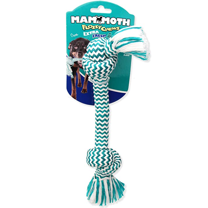 Toss, tug, and floss! Mammoth rope toys are made from premium materials in fun shapes and colors for dogs of all sizes. Rope fibers floss dog's teeth as they chew and play. Safe, long lasting great for games, fetch and play. Built strong to chew and play for hours, perfect for teething puppies.