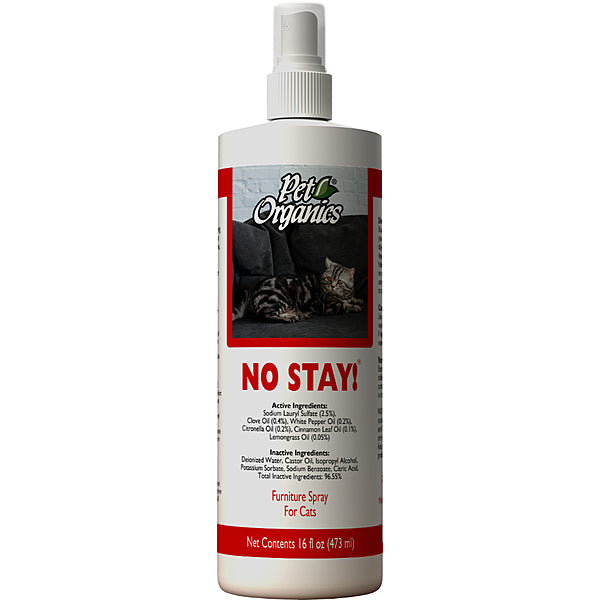 No Stay!™ Furniture Spray for Cats helps train cats to stay off the furniture and other undesired areas. When used as directed it discourages felines from returning to the treated area. Pet Organics No Stay!™ is a special blend of natural herbs that most cats find displeasing and prefer to avoid.