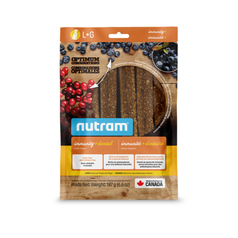 Nutram Immunity+ Dental Treats boost your dog’s natural defence. Cranberries and Blueberries, rich sources of powerful antioxidants, help boost the immune system and promote vitality.