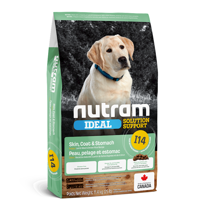 I14 Nutram Ideal Solution Support Skin, Coat and Stomach Dog Food is a holistic, multi-beneficial, and nutrient-rich recipe that improves your pet’s wellness from the inside-out. Nutram's holistic approach starts with digestion through a special combination of easy to digest wholesome proteins, such as real lamb, which combined with pumpkin, a great fiber source, promotes the optimal environment for sensitive stomachs. Nutram's Optimum Combinations also offer flaxseed and salmon oil, rich sources of omega-3 fatty acids, support the normal cognitive development in your young pet. You can be confident that your pet’s food is healing, wholesome and the ideal nutritional choice.