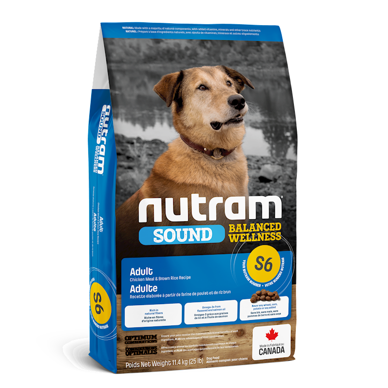 S6 Nutram Sound Balanced Wellness® Adult Dog Food is a Holistic, multi-beneficial, and nutrient-rich recipe that improves your pet’s wellness from the inside-out. Our Holistic approach starts with digestion. Peas and Apples are both low-glycemic, high fiber ingredients. Fiber aids the movement of food through the digestive system, and creates the feeling of fullness, keeping your pet satisfied for longer. This combined with a blend of Flaxseed and Salmon Oil, rich in Omega-3 fatty acids, allows Nutram’s Optimum Combinations™ to provide the nutrients that support healthy skin and a shiny coat. You can be confident that your pet’s food is healing, wholesome and nutritionally sound.