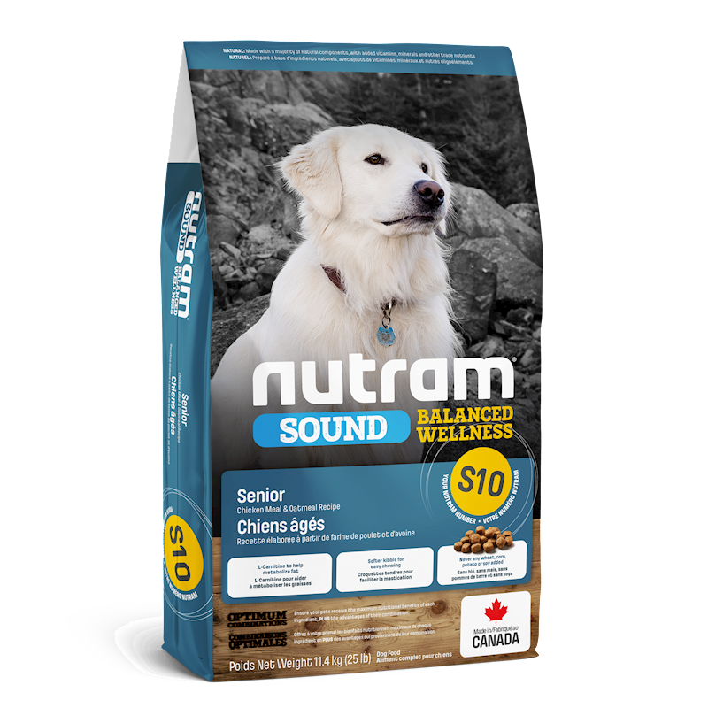 S10 Nutram Sound Balanced Wellness® Senior Dog Food is a Holistic, multi-beneficial and nutrient-rich recipe that improves your pet’s wellness from the inside-out. Our Holistic approach starts with mobility. Formulated with Optimum Combinations™ of Salmon Oil, rich in Omega-3 fatty acids, and Turmeric, a source of curcumin, together provide anti-inflammatory properties that support and improve your pet’s mobility. L-Carnitine also supports your maturing pet’s motility by optimizing fat break-down and increasing lean muscle tissue. Strong immunity is also imperative to an elder dog’s health. Pomegranate and Green Tea have antioxidant properties that will help support your pet’s natural defense against free radical and oxidative stress. You can be confident that your pet’s food is healing, wholesome and nutritionally sound.