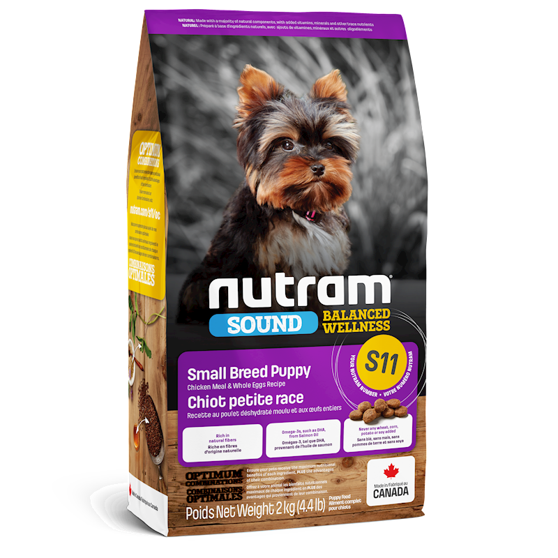 S11 Nutram Sound Balanced Wellness® Small Breed Puppy Food is a Holistic, multi-beneficial and nutrient-rich recipe that improves your pet’s wellness from the inside-out. Our Holistic approach starts with healthy development. Flaxseed and Salmon Oil, rich sources of Omega-3 fatty acids, support the normal cognitive development in your young pet. This, combined with a special combination of Chicory Root, a prebiotic, to promote the growth of natural intestinal bacteria, and Peppermint, to calm and soothe the digestive tract, allows your young pet’s digestive system to function optimally. You can be confident that your puppy is getting a healthy start with this healing, wholesome and nutritionally sound recipe.