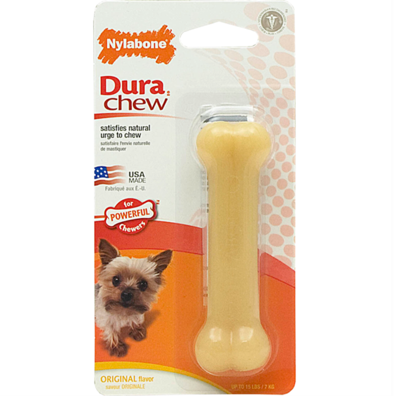 Made with tough, durable nylon, the giant-sized Power Chew DuraChew Ring Chew Toy is a large dog chew toy designed for your aggressive chewer. It provides long lasting enjoyment, satisfies your dog's natural urge to chew, and encourages positive chewing habits. Plus, the bristles raised during chewing promote clean teeth and help control plaque and tartar buildup. This long lasting chew toy is the perfect durable nylon dog bone for dogs who love to chew!