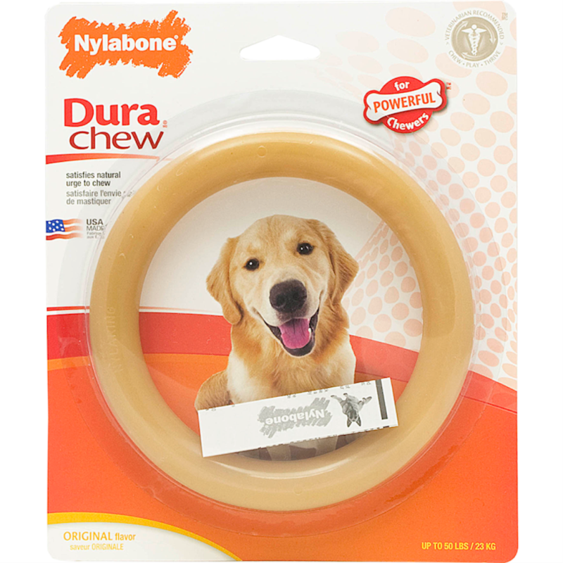 Made with tough, durable nylon, the Power Chew DuraChew Ring Chew Toy was designed for your powerful chewer. It provides long-lasting enjoyment, satisfies your dog's natural urge to chew, and encourages positive chewing habits. Plus, the bristles raised during chewing promote clean teeth and help control plaque and tartar buildup. Go ahead and give your dog a Nylabone! For dogs up to 50lbs.