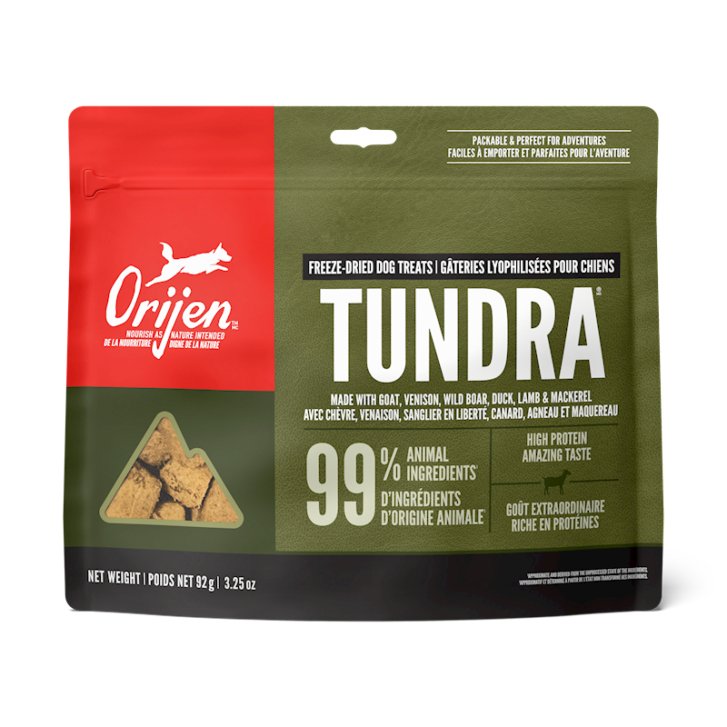 Treat your dog to delicious and nutritious ORIJEN Freeze-Dried Treats. Packed with animal protein, our Tundra Recipe is made with 99%* animal ingredients including goat, venison, wild boar, duck and lamb. Freeze-dried to lock in their rich nutrients and flavour, they’re packable and perfect for adventures. At just five calories each, ORIJEN Freeze-Dried Treats are loaded with protein and amazing taste.