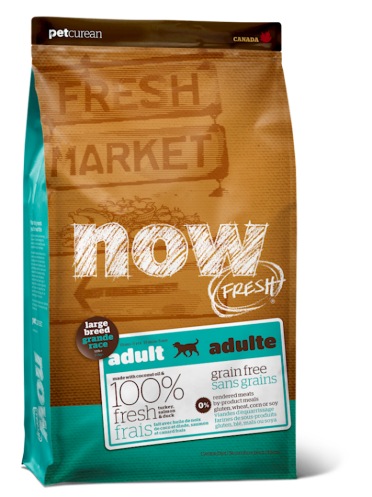 It's no surprise that dogs love the freshness of now. With this Now Fresh Large Breed Adult Recipe, your dog gets 100% fresh turkey, salmon and duck, and 100% fresh omega 3 & 6 oils from coconuts and canola. It also features wholesome berries, fruits and veggies such as peas, spinach, cranberries, pumpkin, blackberries, alfalfa sprouts, kelp, lentils and carrots. Yum! It contains zero grains, gluten, wheat, beef, corn, soy, rendered meats, by products or artificial preservatives. This recipe is suitable for dogs 50+ pounds between 15 months and 5 years of age.