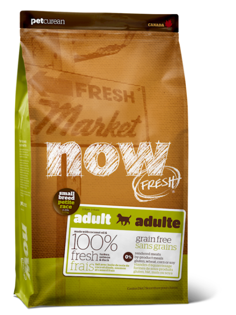 It's no surprise that dogs love the freshness of now. With this Now Fresh Small Breed Adult Recipe, your little one gets 100% fresh turkey, salmon and duck, and 100% fresh omega 3 & 6 oils from coconuts and canola. It also features wholesome berries, fruits and veggies such as peas, spinach, cranberries, pumpkin, blackberries, alfalfa sprouts, kelp, lentils and carrots. Yum! It contains zero grains, gluten, wheat, beef, corn, soy, rendered meats, by products or artificial preservatives.
