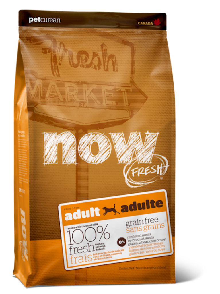 NOW FRESH™ Adult dog food recipe is made with 100% FRESH turkey, salmon, duck and 100% fresh Omega 3 & 6 oils from coconuts and canola. NOW FRESH™ also features zero grains, gluten, wheat, beef, corn or soy. Zero rendered meats, by-products or artificial preservatives.