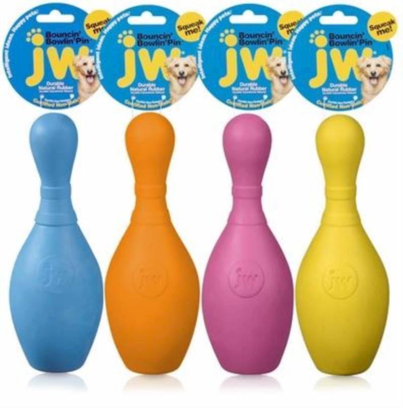 The Bouncin Bowlin Pin is a tough natural rubber dog toy with a classic shape that naturally lends itself to a dog's mouth. Dogs will be bowled over by this toys ability to stand up to rugged playtime, perfect for squeaking, flinging, rolling, and just plain ole carrying around. The iSqueak Bouncin Bowlin Pin squeaker holds up to tough chewers and comes out squeakin' every time!
