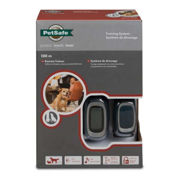 The PetSafe 100m Remote Trainer features 15 levels of static stimulation plus tone and vibration. The Remote sends a signal activating your dog's training collar. With three training options, tone, vibration and static stimulation, you can ensure you will have a well-trained dog in a short amount of time. The 100 Metre Remote Trainer is particularly suited for small to medium dogs - great for around the house training. The system includes training collar with adjustable nylon strap, digital remote, long & short contact points, USB charging cable, test light tool and quick start guide.