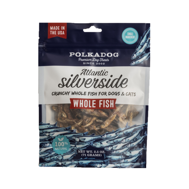These sustainably fished Atlantic Silverside whole fish are slowly dehydrated into delicious, crunchy, digestibly healthy bite-sized delicacies that dogs and cats adore. Bon appétit.