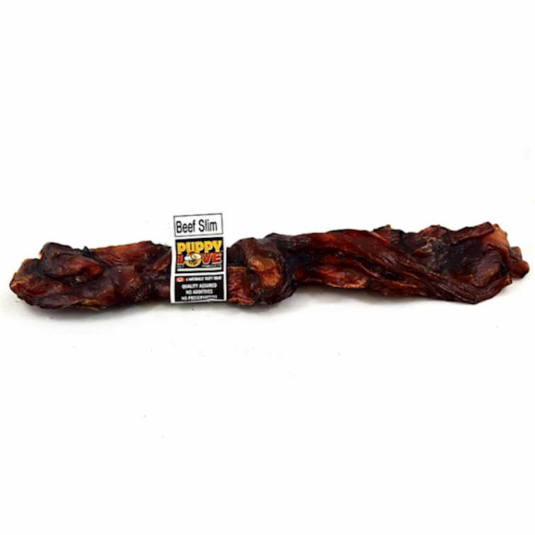 10 to 12 inched in length, Beef Slims are a short to medium lasting chew for all dog sizes. This chew is good source of protein and promotes dental health.