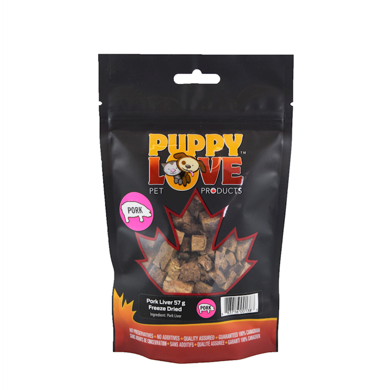 100% Canadian Pork Liver freeze dried to retain as many nutrients as possible. Puppy Love Products contain NO additives, NO preservatives and are 100% natural. Pork liver is an excellent source of vitamins and minerals, such as iron. It’s low in fat and a good source of protein. Freeze Dried Pork Liver is a great treat option for both dogs and cats, with bite size pieces perfect for pets of all sizes. This single ingredient treat is available in three bag sizes: 57 g, 120 g, and 250 g.