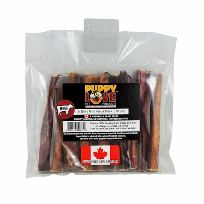 4 to 5 inches in length, this is a medium chew for small and medium sized dogs. Jr Bully Minis are a source of protein and promote dental health.Moisture: 6.2% | Protein: 73% | Crude Fat: 20.07% | Crude Fiber: 1.13%