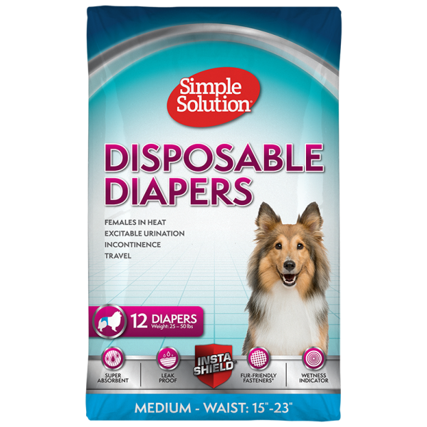 Simple Solution Disposable Female Dog Diapers with adjustable fit feature a stretchable fabric that fits snugly around your pet. The super absorbent core locks in all moisture while leak-proof barriers provide added mess prevention that's guaranteed to work. With stretch waistband protection, your dog can move around freely while staying dry. The tail-hole and extra-long wings help them stay put on the wiggliest of dogs. Attaching and removing the diaper is safe and easy with Fur-Friendly Fasteners. The wetness indicator will tell you when to change them. The Medium size fits waists 15 - 23".