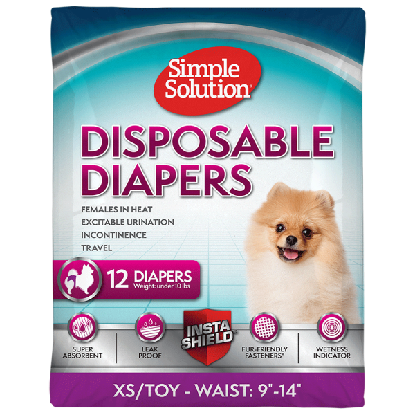 Simple Solution Disposable Female Dog Diapers with adjustable fit feature a stretchable fabric that fits snugly around your pet. The super absorbent core locks in all moisture while leak-proof barriers provide added mess prevention that's guaranteed to work. With stretch waistband protection, your dog can move around freely while staying dry. The tail-hole and extra-long wings help them stay put on the wiggliest of dogs. Attaching and removing the diaper is safe and easy with Fur-Friendly Fasteners. The wetness indicator will tell you when to change them. The XS/Toy size fits waists 9 - 14".