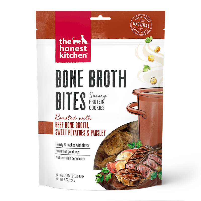 The Honest Kitchen believes that good dogs shouldn't settle for boring biscuits! That’s why our Bone Broth Bites combine savory beef bone broth with nutrient-rich sweet potatoes and a touch of parsley into one healthy bite. Each delicious little cookie is slow baked in small batches and packed with protein so your pup can snack smarter.