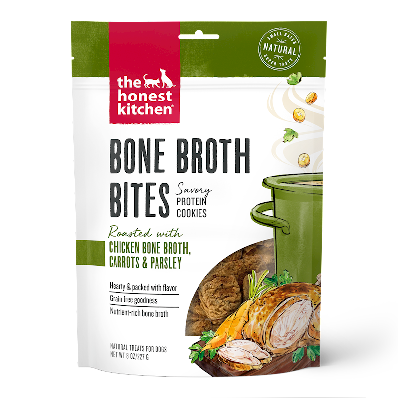 The Honest Kitchen believes that good dogs shouldn't settle for boring biscuits! That’s why our Bone Broth Bites combine savory chicken bone broth with nutrient-rich pumpkin, carrots and a touch of parsley into one healthy bite. Each delicious little cookie is slow baked in small batches and packed with protein so your pup can snack smarter.