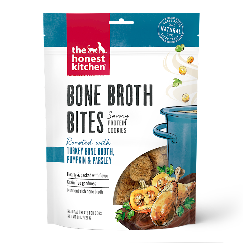 The Honest Kitchen believes that good dogs shouldn't settle for boring biscuits! That’s why their Bone Broth Bites combine savory turkey bone broth with nutrient-rich pumpkin, carrots and a touch of parsley into one healthy bite. Each delicious little cookie is slow baked in small batches and packed with protein so your pup can snack smarter.