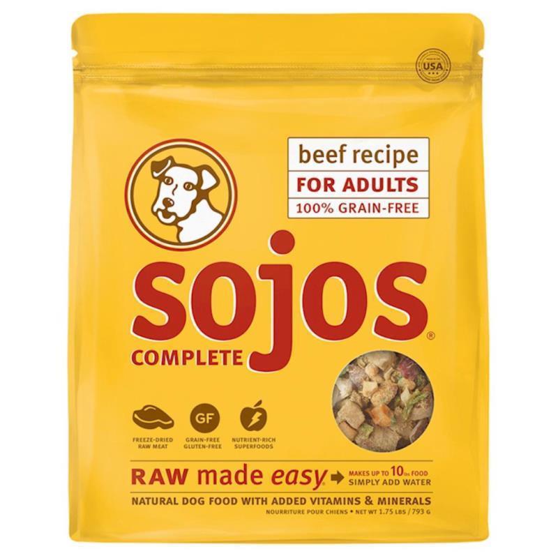 Give your pooch the simple power of raw nutrition in just minutes with the Sojos Complete Beef Recipe Adult Grain Free freeze dried Raw Dog Food. Made with real, fresh beef as the first ingredient plus whole eggs and fruits and veggies like sweet potatoes, cranberries, and flaxseeds, it’s packed with protein and nose-to-tail nourishment from raw ingredients in every bite. The Vet recommended formula is gently freeze dried to preserve the natural enzymes, vitamins and trace nutrients, and is loaded with health-boosting superfoods like ginger, kelp, pumpkin, papaya and more. Just add water, soak to activate the raw goodness, and watch your pooch dive into his bowl every time!